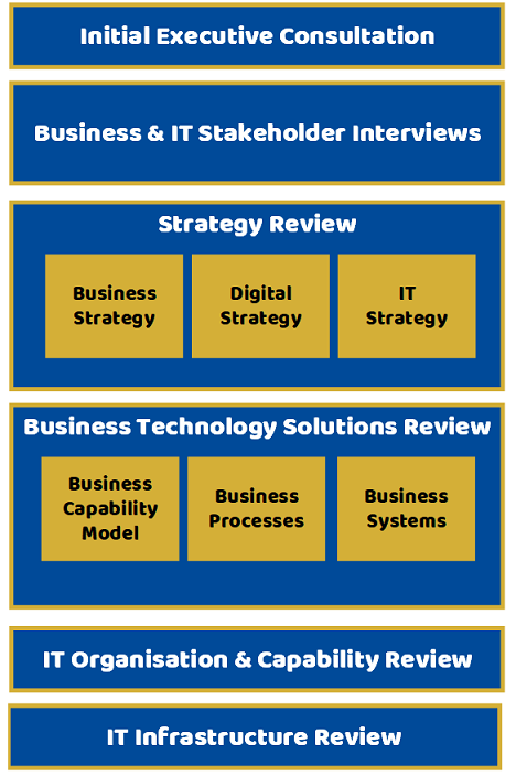 We begin with a free initial consultation with the Chief Executive / Business Owner to discuss the business context and purpose for the review. This is followed by one-on-one interviews with members of the Executive Leadership Team to understand their business requirements and the ability of current IT solutions to meet those requirements.